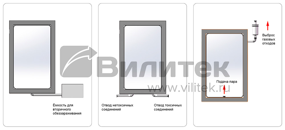 Главная особенность серии— наличие системы биологической герметизации и высокоэффективной фильтрации всех отводящих сред. В отличие от общепромышленных моделей, данные установки исключают любой несанкционированный выброс контаминированного воздуха или стоков из камеры до момента их полного обеззараживания.