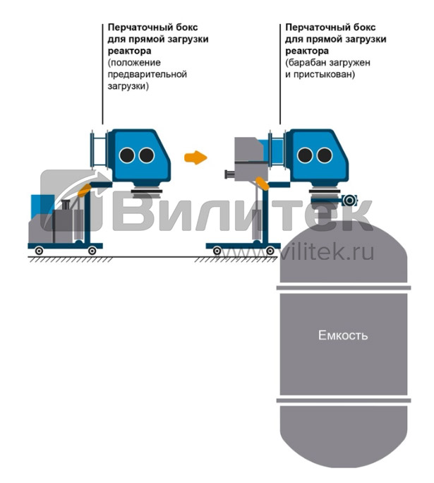 Благодаря коническому бункеру с выгрузным клапаном боксы VILITEK VBOX R обеспечивают безопасность при переносе порошков из первичной упаковки в реактор, защищая персонал и производственную среду от воздействия токсичных и высокоактивных веществ. Конструкция адаптируется под различные типы реакторов и загрузочных люков – от стандартных фланцевых соединений до нестандартных конфигураций в условиях ограниченного пространства.