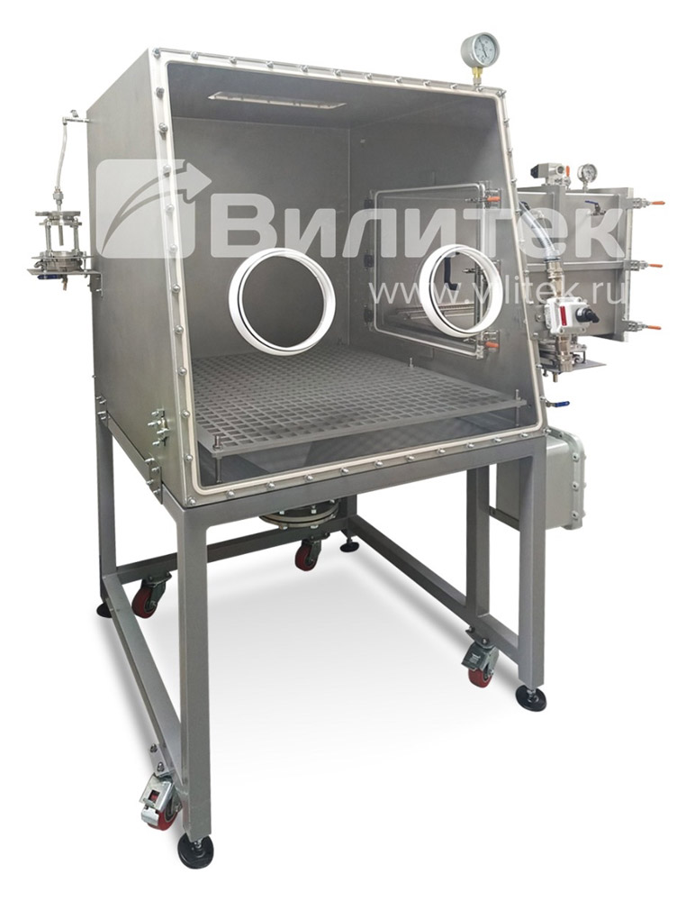 - Эргономика и процессная эффективность – конструкция боксов для загрузки реакторов разрабатывается компанией Вилитек с учётом реальных условий работы операторов. Прозрачное окно обеспечивает полный визуальный контроль процесса загрузки, расположение перчаточных портов проектируется индивидуально для удобной работы с тарой различного формата – от пакетов до небольших контейнеров. Мы можем изменить высоту рабочей зоны, угол наклона панелей, количество и диаметр перчаточных портов.